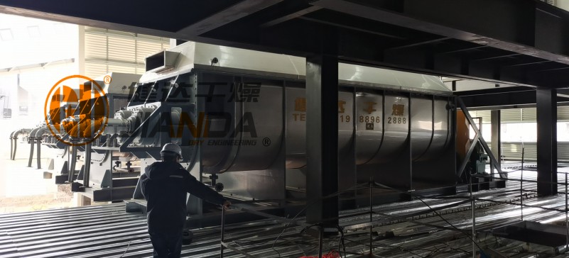 此套生物质炭粉空心桨叶干燥机,型号为KGJ-300,包含干化主系统、供料及返粉系统、热风系统、干燥系统、尾气处理系统和控制系统等。材质上,因物料的特殊性,我司在原有的基础上升级改造,在主体中与产品接触处,均采用了国内厂家极少使用的2507双相不锈钢,其具有极好抗点腐蚀,缝隙腐蚀和均匀腐蚀能力,能有效减少物料粘度,使系统始终保持在稳定运行状态;在设备结构上,采用了全封闭的形式,有效防止了物料与空气间的交叉污染,保障了作业环境的清洁度;控制系统稳定可靠,可根据客户的需要更改为全自动或半自动操作。